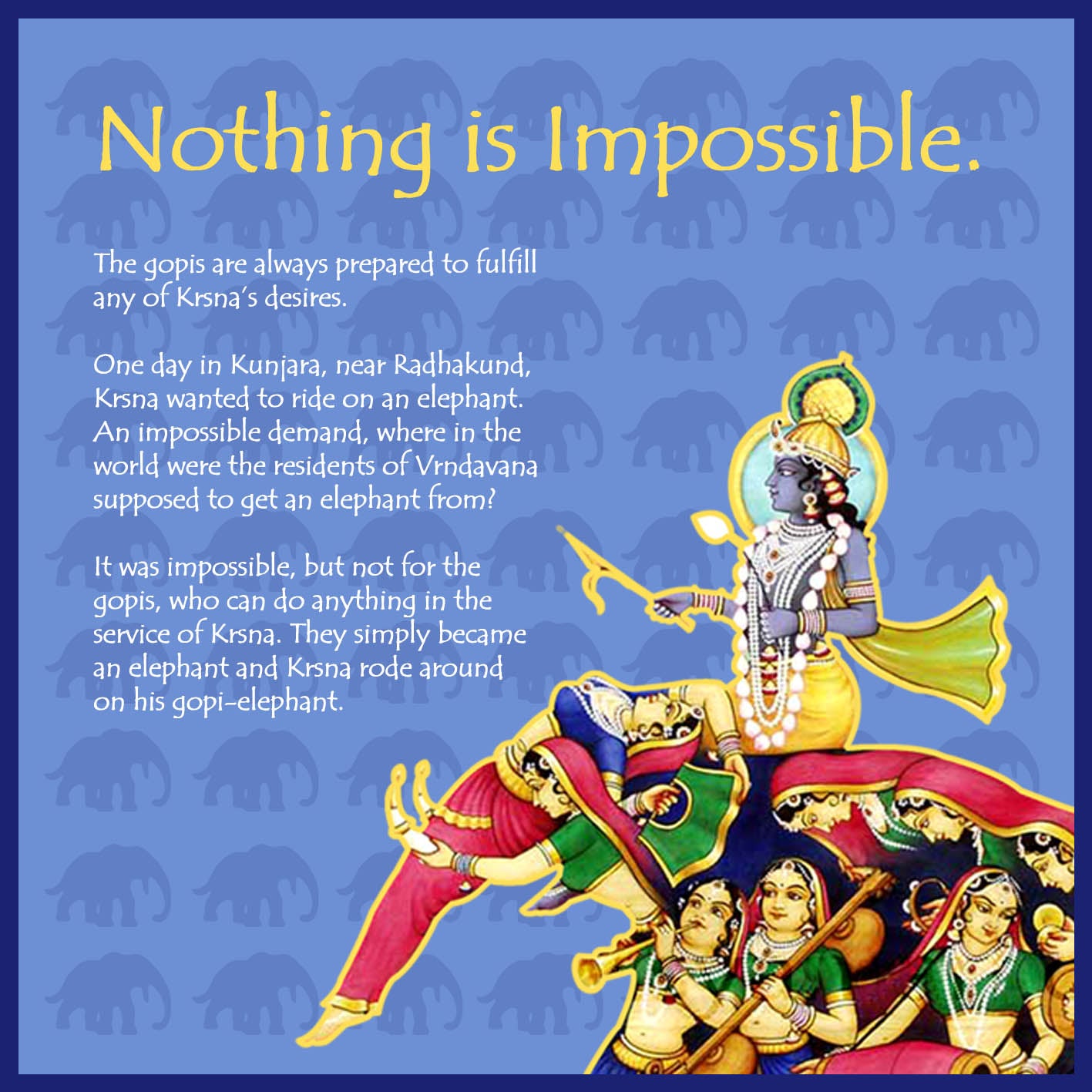 Nothing is Impossible and Kadamba Kanana Swami proves that singing can take you back to the spiritual world. The gopis are always prepared to fulfill any of Krsna’s desires. One day in Kunjara, near Radhakund, Krsna wanted to ride on an elephant. An impossible demand, where in the world were the residents of Vrndavana supposed to get an elephant from?